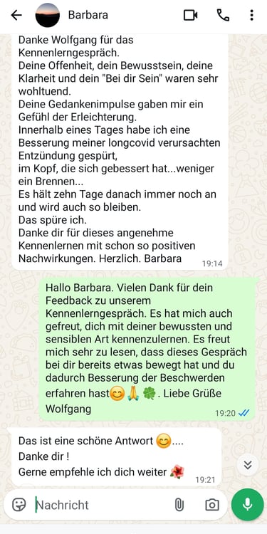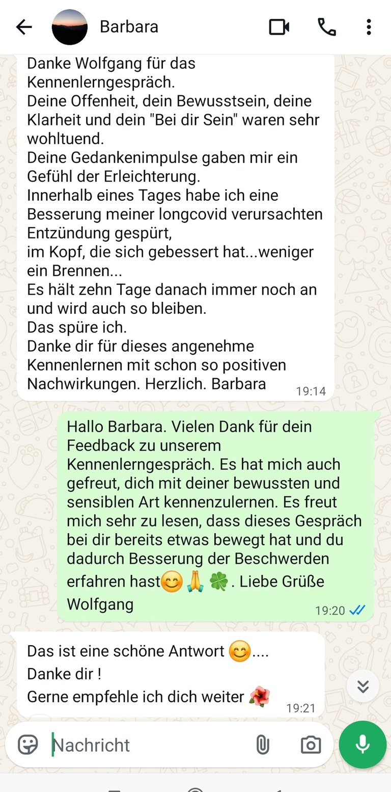 "Ich wollte Dir noch mal Danke sagen für die letzte Sitzung, denn ich habe tatsächlich Besserung verspürt, auch wenn ich noch nicht vollständig gesund bin, spüre ich eine Veränderung.