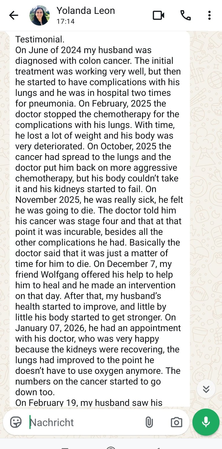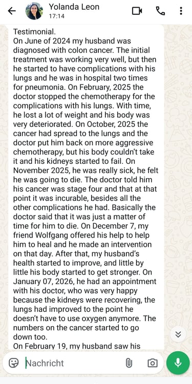 Lieber Wolfgang, ich kann dir nicht genug für deine unglaubliche Unterstützung und Effektivität in der Behandlung danken. Nachdem ich mich wegen Schwäche, Müdigkeit, Motivationsmangel und chronischen Krankheiten an dich gewandt hatte, spürte ich schon nach der ersten Sitzung bemerkenswerte Veränderungen in meinem Wohlbefinden.Ihre Kompetenz und Ihr Verständnis für meine Situation haben mir geholfen, Energie und ein Gefühl der Vitalität wiederzuerlangen. Insbesondere die Verbesserungen bei chronischen Erkrankungen waren für mich ein großer Erfolg.Ich bin beeindruckt von Ihrer Professionalität und Ihrem Einsatz für die Patienten.Ich danke Ihnen für die wichtige Arbeit, die Sie leisten. Mit Respekt und Dankbarkeit, Ich werde mich wieder an Sie wenden, um weitere Unterstützung zu erhalten. Ich wünsche Ihnen viel Erfolg bei all Ihren medizinischen Unternehmungen.